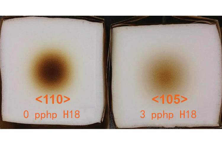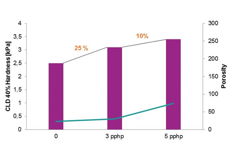 與市場(chǎng)上的其他硬化添加劑不同,NT ADD H18可顯著提高硬度,同時(shí)不影響泡沫的孔結(jié)構(gòu)。當(dāng)NT ADD H18添加到配方中時(shí),沒(méi)有必要改變TDI或錫的量來(lái)維持開(kāi)孔結(jié)構(gòu)。使用量為1至5pphp,取決于所需的硬度增加。取決于泡沫密度,配方和生產(chǎn)參數(shù),可以在不顯著改變孔結(jié)構(gòu)的情況下提高35%的硬度。