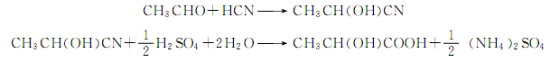 將乙醛和冷的氫氰酸連續(xù)送入反應(yīng)器生成乳腈,再用泵壓入水解釜,并加入水和硫酸催化水解得乳酸;加乙醇酯化后精餾分出乳酸乙酯;后送入濃縮罐加熱分解而得精乳酸。