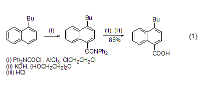 羧基的引入 在AlCl3催化下,DPC-Cl 可在芳環上引入一個羧基。烷基或烷氧基取代的芳環容易發生反應。產物二苯基酰胺用堿水解,再酸化可得到羧酸 (式1)[1]。